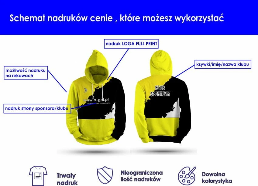 Bluza z kapturem Full Print marki A-GOL to doskonały wybór dla grup, które chcą podkreślić swoją tożsamość i wyróżnić się spójnym wizerunkiem. Idealnie sprawdzi się dla klubów sportowych, drużyn amatorskich, stowarzyszeń kibiców oraz szkół.