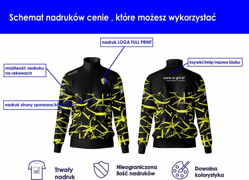 Odzież sportowa personalizowana marki A-GOL oferuje pełną personalizację – dowolną kolorystykę oraz dowolną ilość nadruków, umieszczonych według indywidualnych preferencji. Istnieje możliwość zaprojektowania bluzy od podstaw, co pozwala idealnie dopasować ją do potrzeb klubu, drużyny, firmy lub własnego stylu. To praktyczne i estetyczne rozwiązanie dla osób ceniących wygodę oraz unikalny wygląd.