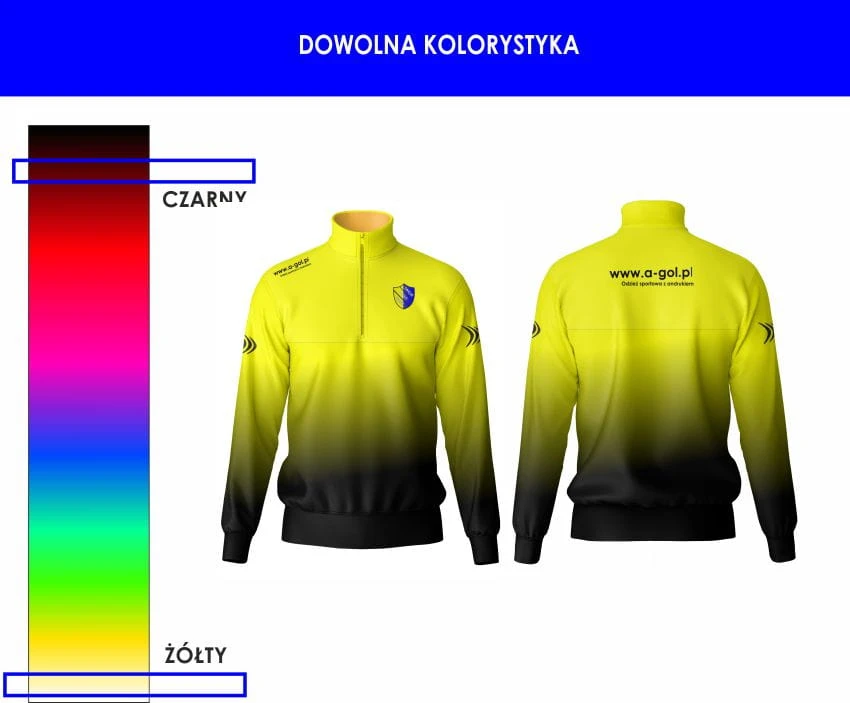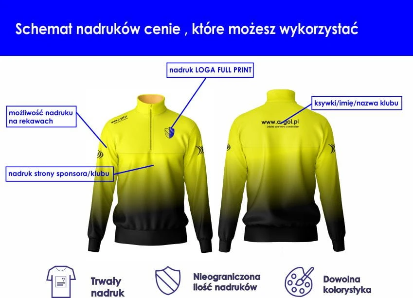 Odzież sportowa personalizowana marki A-GOL oferuje pełną personalizację – dowolną kolorystykę oraz dowolną ilość nadruków, umieszczonych według indywidualnych preferencji. Istnieje możliwość zaprojektowania bluzy od podstaw, co pozwala idealnie dopasować ją do potrzeb klubu, drużyny, firmy lub własnego stylu. To praktyczne i estetyczne rozwiązanie dla osób ceniących wygodę oraz unikalny wygląd.