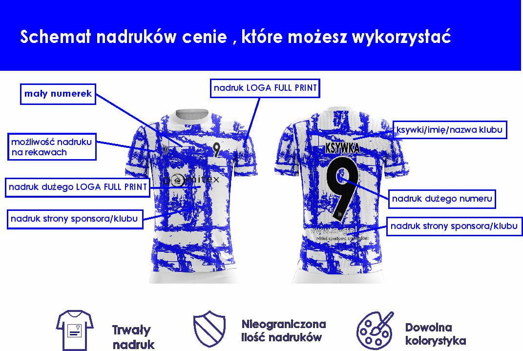 Dowolna kolorystyka, nieograniczona ilość nadruków. Umieść dowolny napis/logo, w dowolnym miejscu na odzieży. Opcja FULL PRINT w cenie.